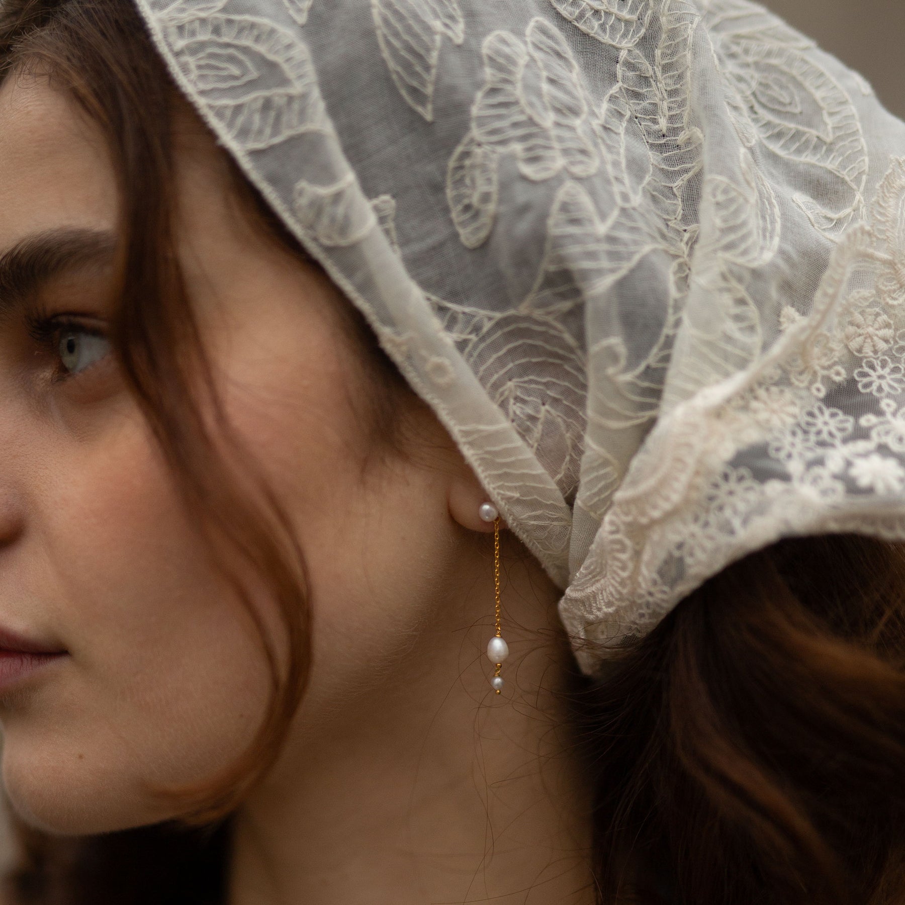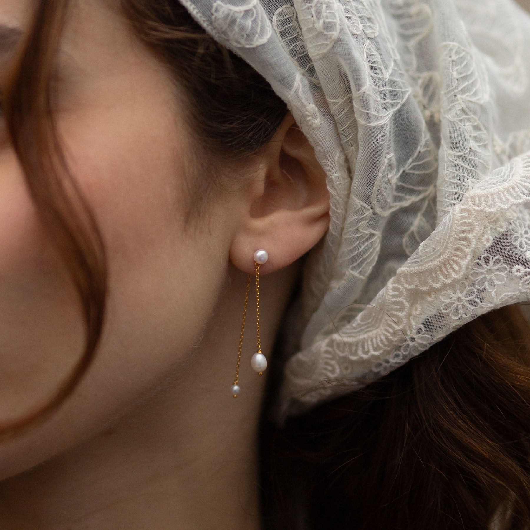 Normaler Preis €99.00Feine Ohrstecker, bei denen zwei zarte Ketten mit schimmernden Perlen sanft am Ohr herabfallen. Die Perlen bewegen sich leicht bei jeder Bewegung und fangen das Licht ganz subtil ein. Elegant, feminin und unaufdringlich – ein leiser Akzent, der den Look mühelos veredelt.