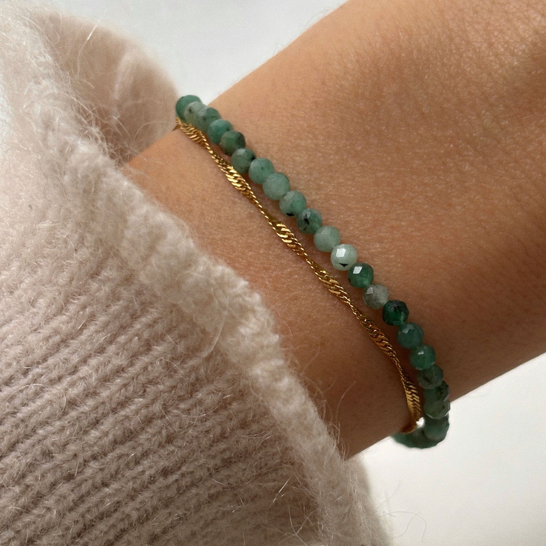 Normaler Preis €85.00Die Emerald Eden Armkette vereint natürliche Eleganz mit einem Hauch urbaner Leichtigkeit. Facettierte Smaragd-Perlen schimmern in lebendigen Grüntönen – von sanftem Apfelgrün bis hin zu tiefem Edelstein-Grün. Jede Kette ist ein Unikat und trägt die Einzigartigkeit der Natur in sich.