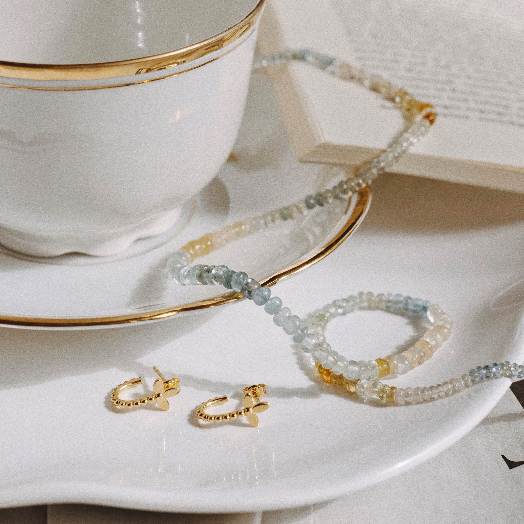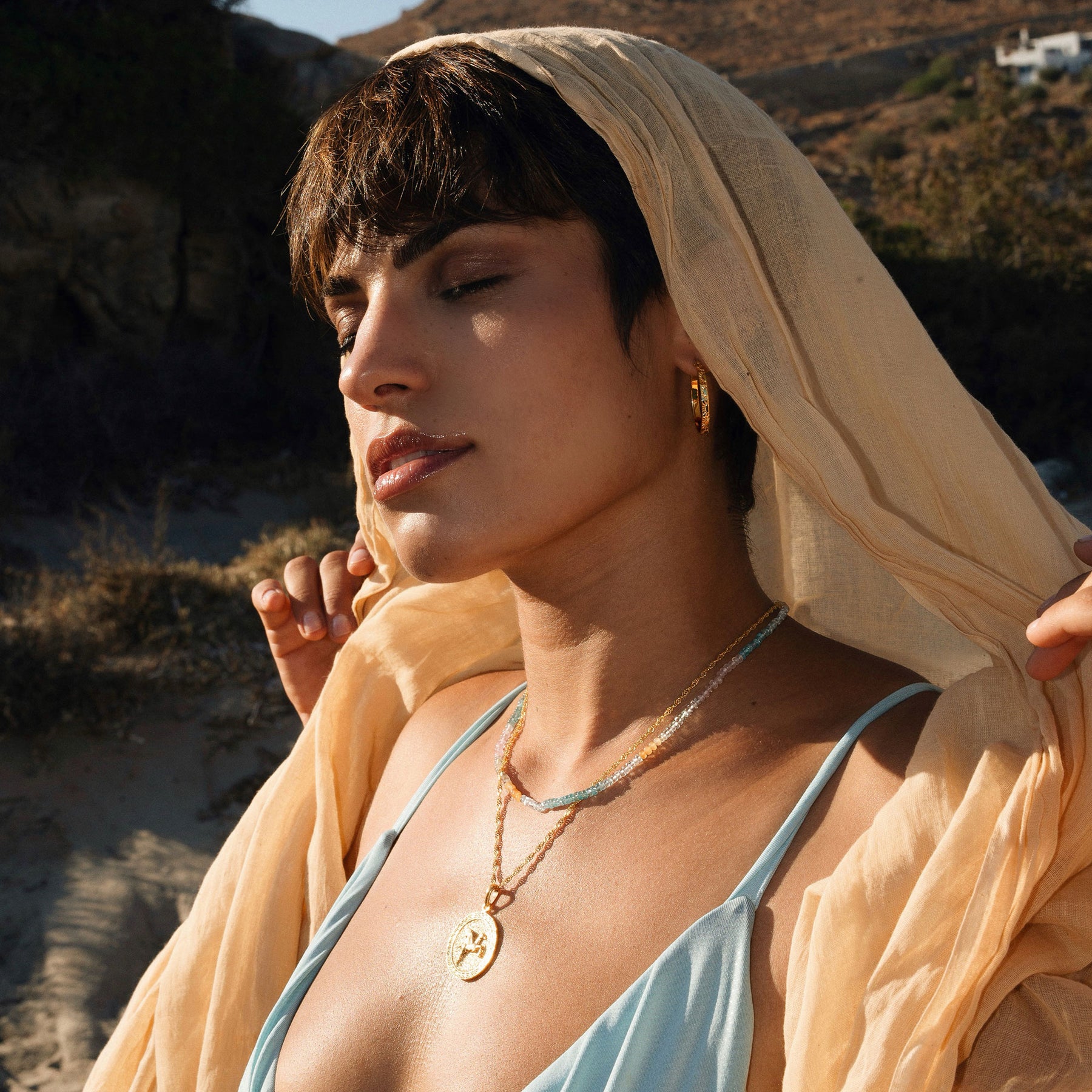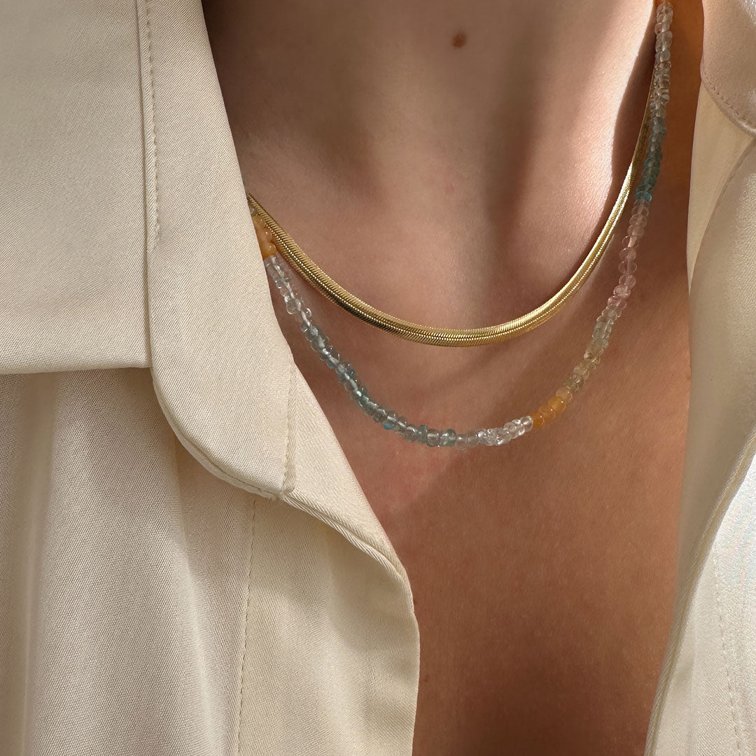 Die Tulum Halskette vereint von Hand verlesene Saphir-, Aquamarin- und Rosenquarz-Edelsteine in zarten Pastelltönen, die an Sonne, Strand und den Zauber von Tulum erinnern. Jeder Stein ist ein Unikat und fängt das Licht auf seine eigene Weise ein – für ein dezentes, natürliches Strahlen, das dich das ganze Jahr über begleitet.